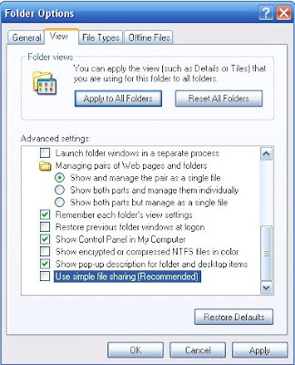 در داخل تب View تیک کنار Use simple file sharing (Recommended) رو حذف کنید . با این کار شما می تونید در قسمت Properties هر فایل یا فلدر یک قسمت Security نمایش داده میشه که از اونجا میشه دسترسی ها رو برای فایل ها و فلدر ها تعیین کرد.