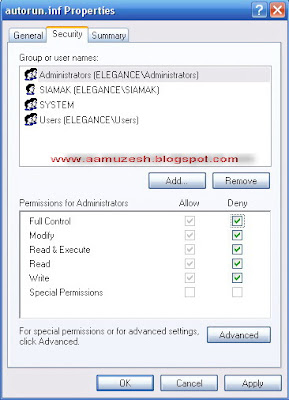 شما با این کار دسترسی کل سیستم رو به این فایل قطع کردید . این باعث میشه که وقتی یک ویروس خواست تا یک فایل Autorun درست کنه به دلیل اینکه فایل از قبل وجود داره باید فایل موجود رو پاک کنه تا فایل خودش رو درست کنه ، ولی چون اجازه دسترسی به فایل رو نداره نمی تونه اون رو پاک کنه .